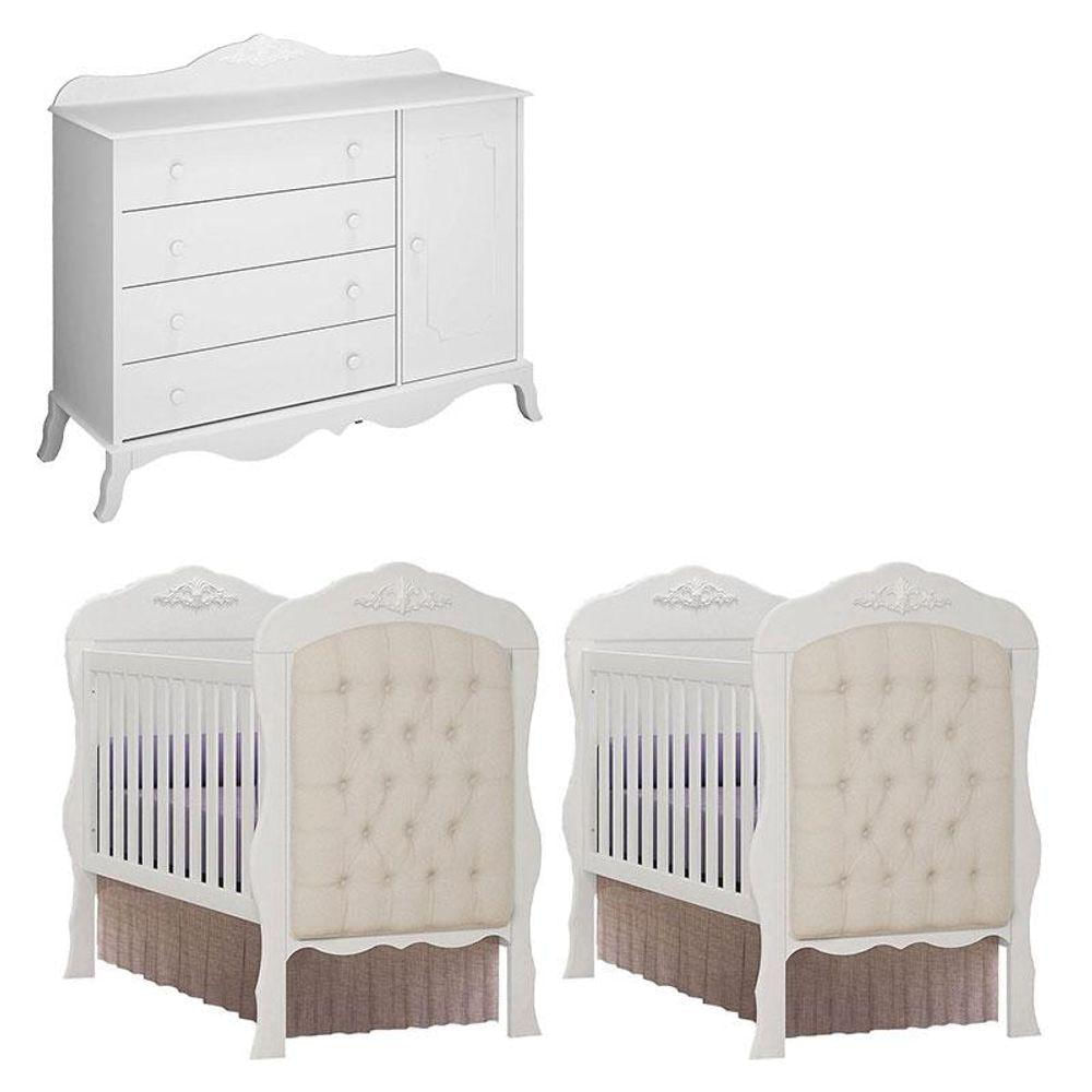 02 Berços Americano Com Capitonê E Cômoda Infantil Realeza Branco Acetinado - Canaã