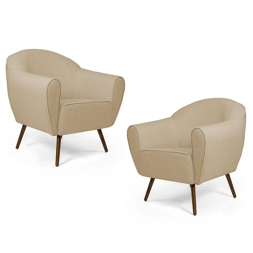 Kit 02 Poltronas Decorativas Nina Pés Palito Madeira C-129 Linho Bege Escuro - Domi