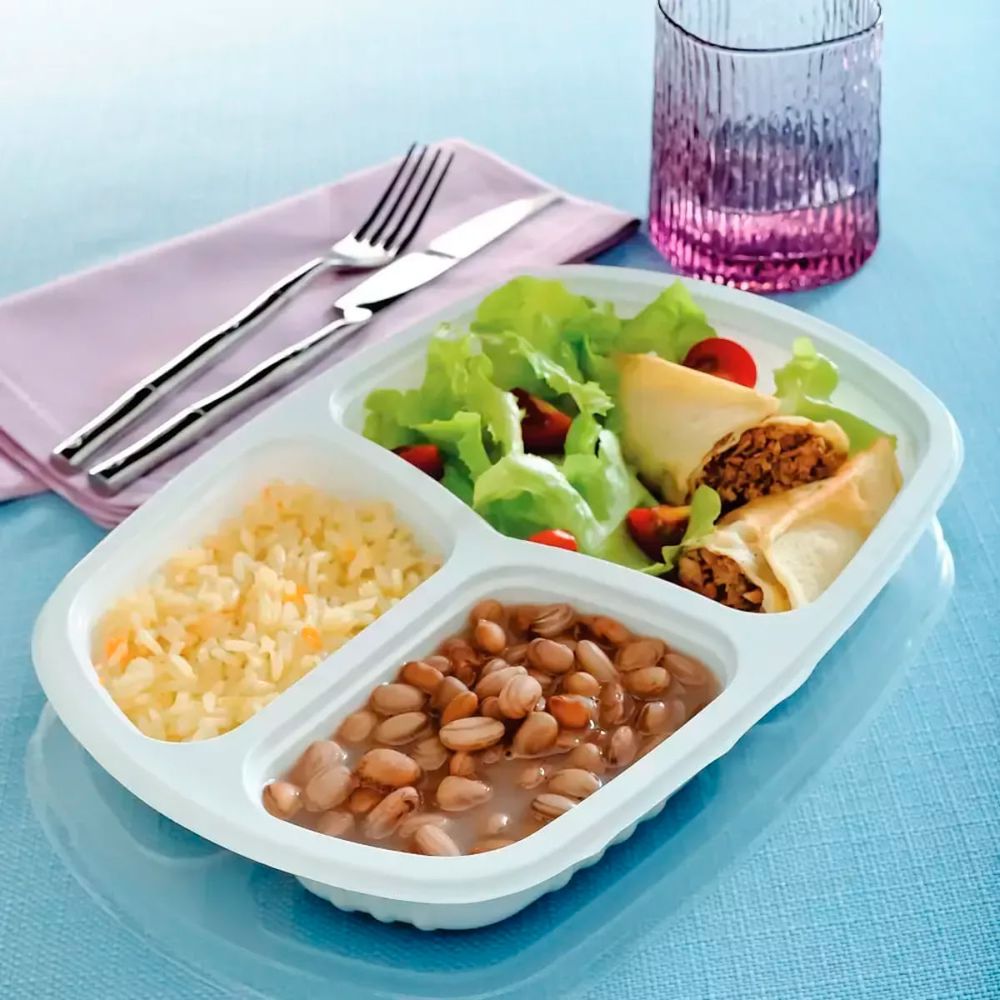 100un Bandeja Refeição com 3 Divisórias 850ml G331 Branco Freezer Microondas Galvanotek