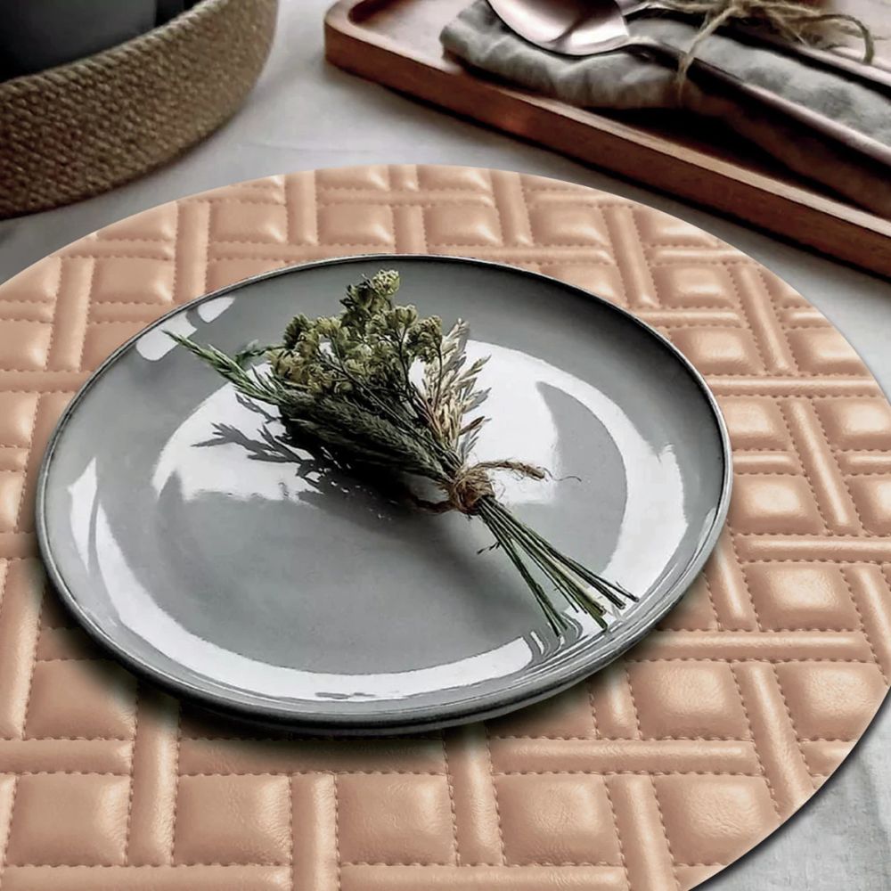 ALTO PADRÃO - MESA ELEGANTE EM TODOS OS MOMENTOS Esse Jogo Americano possui lindo desenho em relevo acentuado proporcionando um excelente efeito visual à mesa e combina com diversos tipos de louças e ambientes. Feito com material de alto padrão de qualidade, sua gravação imita costuras com perfeição, mas ao mesmo tempo ele não retém resíduos de alimentos e é muito fácil de limpar proporcionando praticidade para o dia a dia. VANTAGENS - Material de Alto Padrão; - 100% Impermeável; - Prático e Versátil; - Flexível e Resistente; - Design Exclusivo; - Fácil de limpar: basta passar um pano úmido e sabão neutro; CONTÉM: 12 peça(s). COR: Rosê DIMENSÕES: 38cm de diâmetro MATERIAL: PVC 100% Impermeável Somos fabricantes, por isso o melhor preço para esse produto. Um produto exclusivo Idealiza Comercio de Utilidades