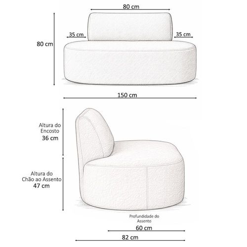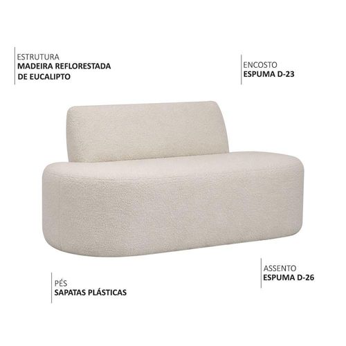 Sofá Reto Mônaco – As linhas retas trazem presença, e os cantos arredondados trazem acolhimento.Design arredondado que transforma espaços e adiciona leveza ao décor!Descrição do ProdutoSe você busca inovação com estilo, o Sofá Reto Mônaco é a escolha perfeita. Com um design arredondado, ele é ideal para dividir ambientes com elegância, suavizando o visual do espaço. A ausência dos braços de apoio proporciona liberdade para diversas composições e combinações, tornando-o uma peça-chave na decoração contemporânea. Seu revestimento em bouclé e o assento amplo oferecem máximo conforto para quem deseja relaxar com estilo.Garanta já o seu e transforme sua casa com personalidade e bem-estar!Características Técnicas Estrutura: Madeira reflorestada de eucalipto com partes em MDF e OSB – sustentável e resistente. Assento: Espuma D-26 HR sobre percintas elásticas – conforto durável e firme. Encosto: Espuma D-23 sobre percintas elásticas – apoio macio e ergonômico. Revestimento: Bouclé – toque suave e visual sofisticado. Pés: Sapatas plásticas. Cor dos Pés: Preto. Quantidade de Pés: 6. Peso Suportado: Até 100 kg por assento. Medidas Altura Total: 80 cm Largura: 150 cm Profundidade: 82 cm Peso: 39 kg Altura do Encosto: 36 cm Altura do Assento ao Chão: 47 cm Altura dos Pés: 1 cm Largura do Assento: 150 cm Profundidade do Assento: 60 cm Diferenciais Design arredondado contemporâneo – tendência de decoração atual. Ausência de braços – mais liberdade para combinar e posicionar. Estrutura de madeira reforçada – robustez e longa durabilidade. Quantidade de Volumes: 1. Necessita de Montagem: Não – pronto para decorar! Cuidados Limpeza com pano levemente umedecido e depois pano seco. Evite exposição direta ao sol para preservar a cor do tecido. Não sentar nos encostos ou laterais do sofá. Evite escovas e produtos abrasivos. Garantia 3 meses contra defeitos de fabricação. Observações Imagens meramente ilustrativas; pode haver variação de tonalidade conforme o monitor. Objetos decorativos não acompanham o produto. Produto enviado embalado com segurança para transporte. Verifique a embalagem no momento da entrega e registre qualquer dano. Entregamos até a porta ou portaria indicada. Certifique-se de que as dimensões são compatíveis com o local de entrega e instalação. Não realizamos montagem, desmontagem, nem transporte por escadas, elevadores ou uso de guinchos.