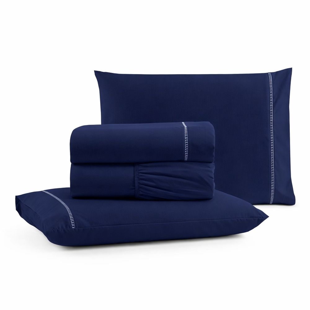 Jogo de Lençol King Premium Soft 600 Fios Micropercal Azul Marinho Ponto Palito Toque Macio 4 Peças