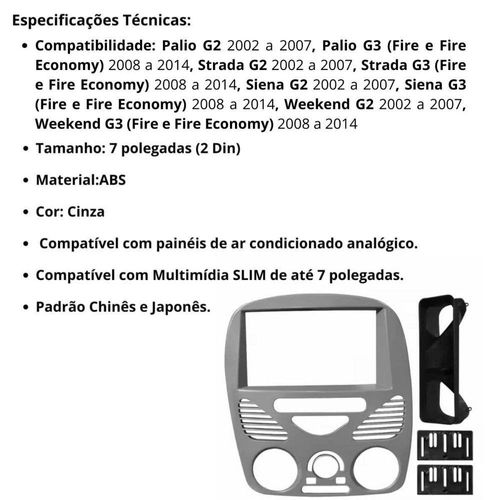 Veículos Compatíveis:- Palio G2 2002 a 2007- Palio G3 (Fire e Fire Economy) 2008 a 2014- Strada G2 2002 a 2007- Strada G3 (Fire e Fire Economy) 2008 a 2014- Siena G2 2002 a 2007- Siena G3 (Fire e Fire Economy) 2008 a 2014- Weekend G2 2002 a 2007- Weekend G3 (Fire e Fire Economy) 2008 a 2014>>> Sobre o Produto: