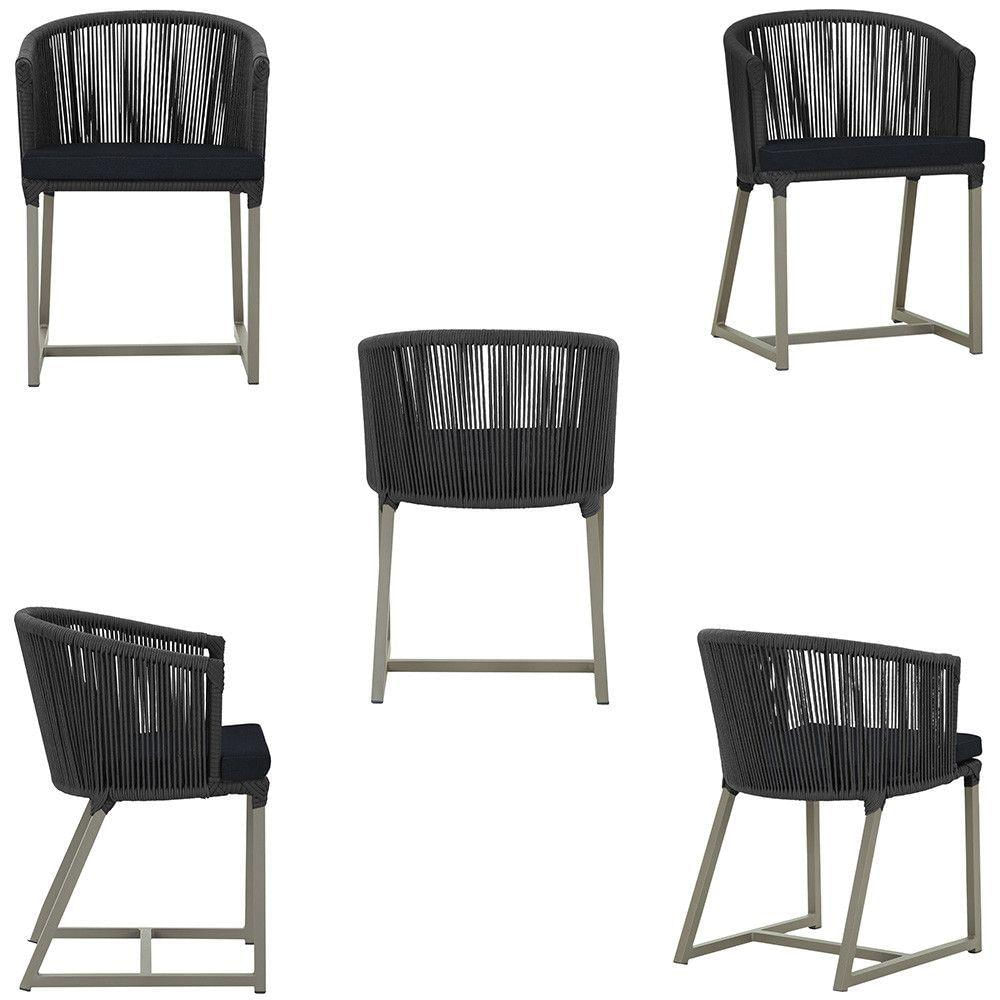 Combinando estilo e resistencia, esta cadeira traz o melhor do design contemporaneo em aluminio com micro pintura e acabamento em corda nautica. O estofado impermeavel completa o conforto e a funcionalidade, tornando-a ideal para ambientes externos e internos.