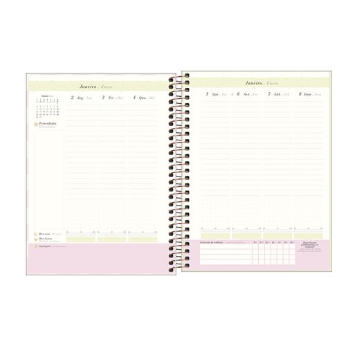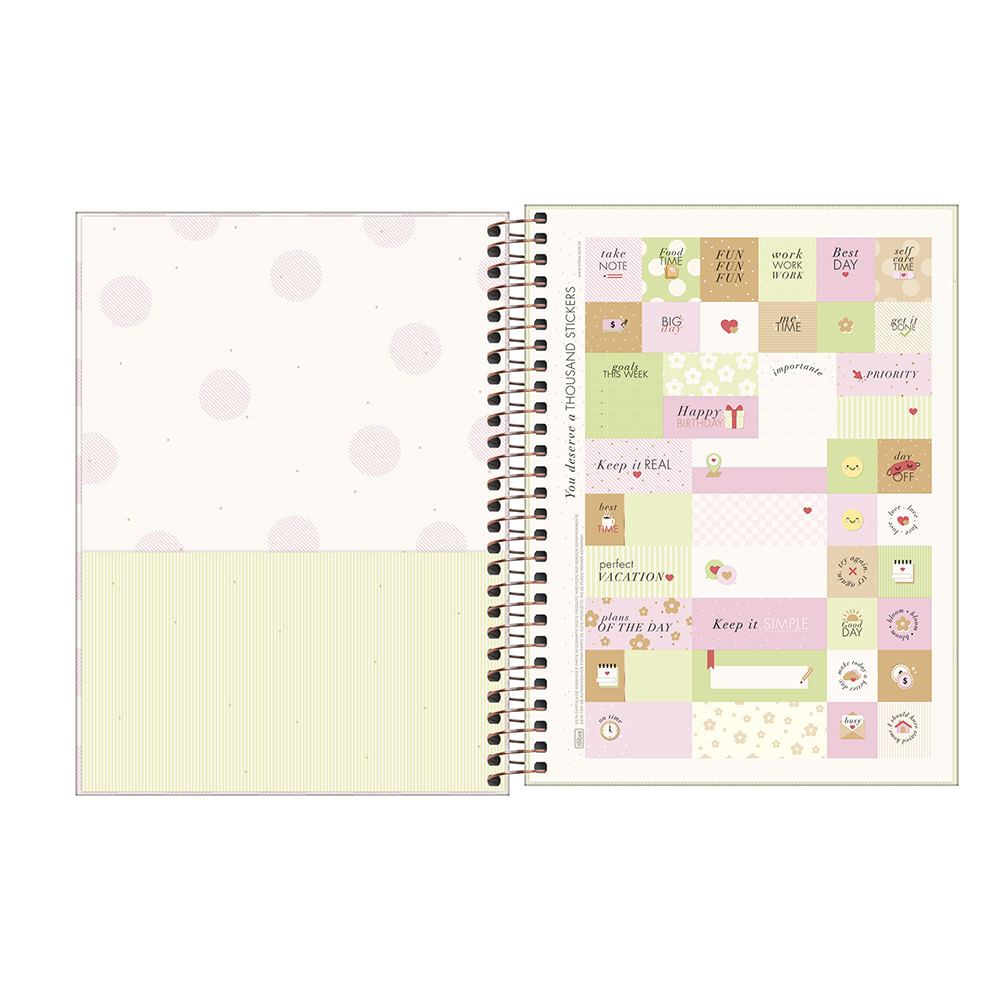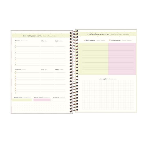 Ela conta ainda com capa dura, parte interna decorada, hot stamping, folha de adesivos, bolsa em papel para guardar documentos, fechamento em elástico e acabamento em espiral.