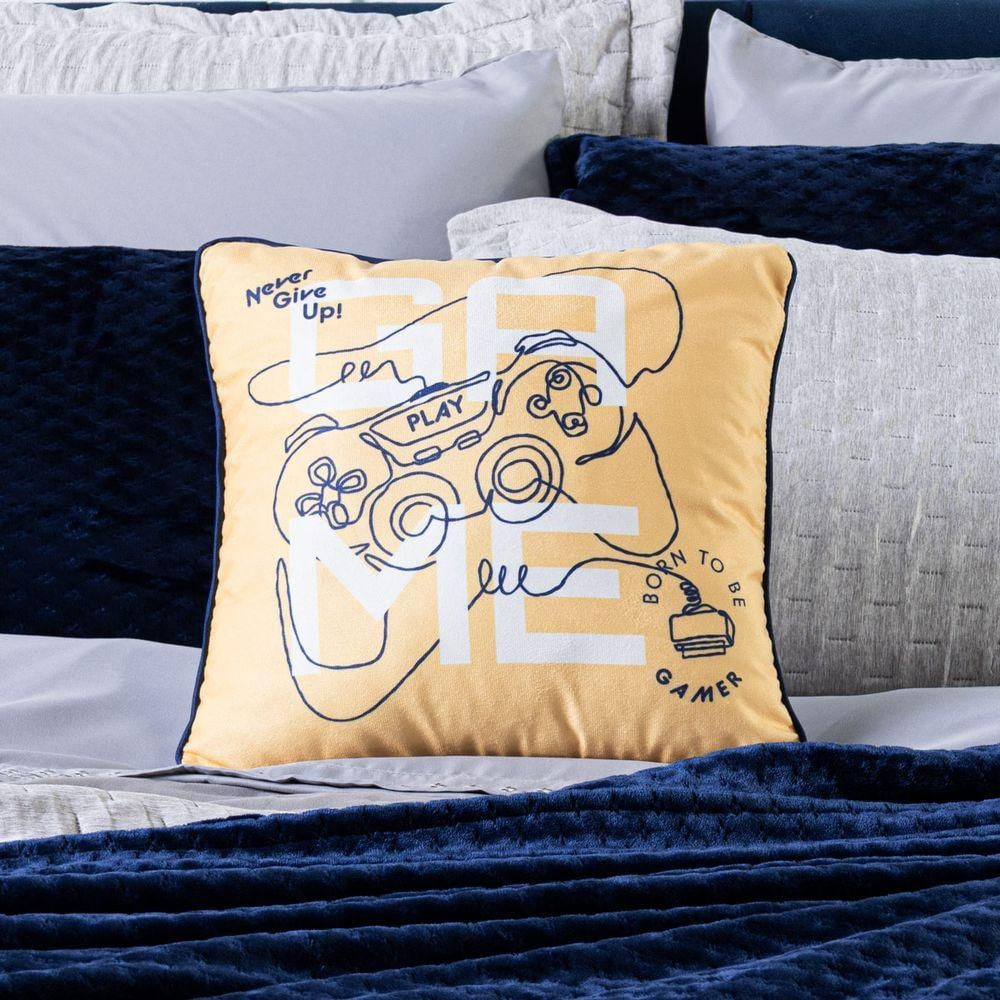 Almofada Avulsa Blend Game Amarela Estampada Cheia Em Veludo Suede Com Enchimento Em Refil Silicone