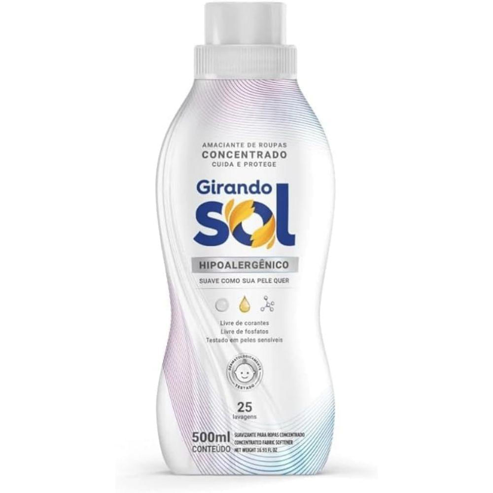 Amaciante Concentrado Hipoalergênico para Roupas de Bebê Girando Sol 500MlO Amaciante Concentrado Hipoalergênico Girando Sol é uma escolha ideal para quem busca cuidar das roupas com carinho e eficiência. Este produto foi especialmente formulado para oferecer suavidade e proteção, garantindo que suas roupas fiquem macias ao toque e fáceis de passar. Características Concentrado: Uma pequena quantidade rende muito. Com apenas 500 ml, você pode realizar até 25 lavagens, otimizando o consumo e oferecendo um excelente custo-benefício.Livre de Corantes e Fosfatos: Este amaciante é livre de substâncias que podem causar alergias ou irritações, tornando-o uma escolha segura para todas as peles, especialmente as mais sensíveis.Dermatologicamente Testado: O produto foi testado rigorosamente em peles sensíveis, garantindo que é seguro e eficaz para todos os membros da família.