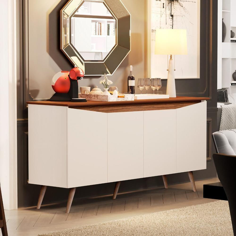 Aparador Buffet 4 Portas Retrô Com Pés De Madeira Off White / Freijó