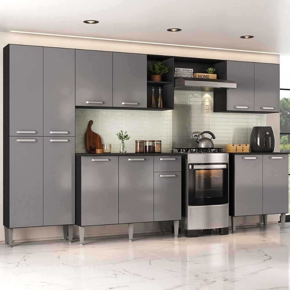 Armário Cozinha Modulada Completa 298cm Pequim Top Multimóveis Mp3768 Preto/lacca Fumê