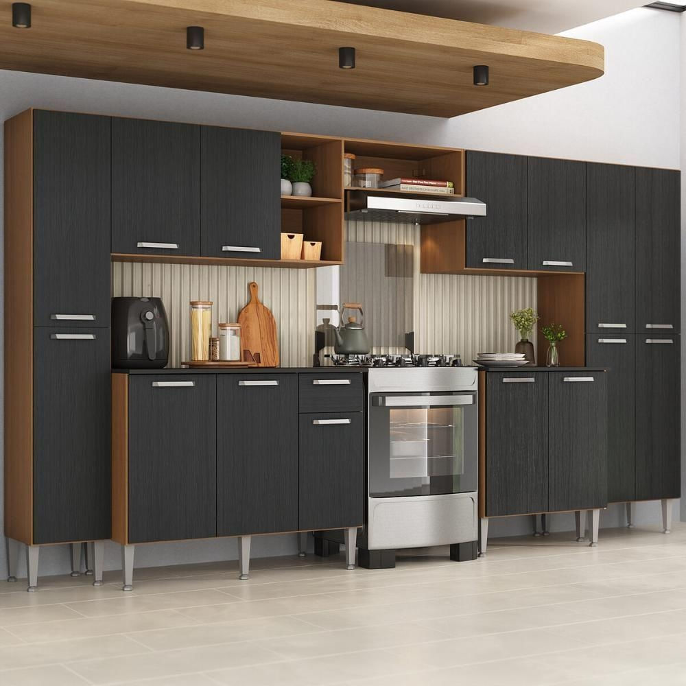 Armário Cozinha Modulada Completa 329,5cm Pequim Top Multimóveis Mp3767 Madeirado/preto