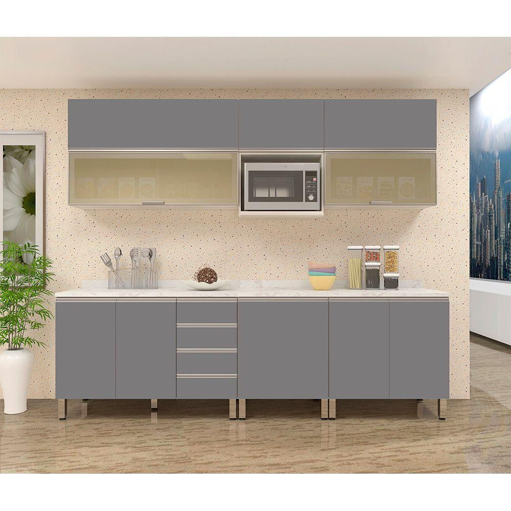 Armário de Cozinha Completa 8 Peças com Tampo Legno Crema com Cinza Puro Lis Luciane Móveis