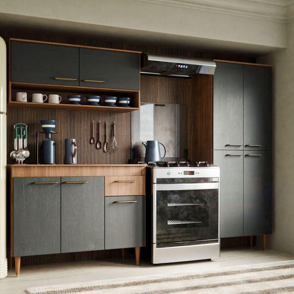 Armário De Cozinha Antonella Com 9 Portas E 1 Gaveta Paneleiro Carvalho Grafite - Maxi Do Brasil