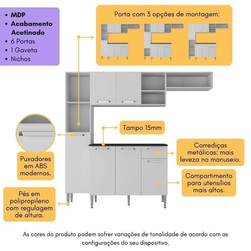 O Armário de Cozinha Compacta Smart Multimóveis MP2183 é a solução perfeita para otimizar o espaço, tornando-o ideal para ambientes menores. Fabricado em MDP 12/15mm com acabamento acetinado (cerca de 20% de brilho), este armário oferece durabilidade e resistência. Com amplo espaço interno, possui 6 portas com dobradiças metálicas, 1 gaveta com corrediças metálicas (mais leveza no manuseio), nichos e prateleiras para armazenar todos os itens essenciais da cozinha, mantendo-os ao alcance das mãos e bem organizados. O espaço dedicado para fogão ou geladeira oferece ainda mais versatilidade, permitindo que você aproveite ao máximo o espaço disponível. Além disso, conta com pés em polipropileno com regulagem de altura, que proporcionam estabilidade, e puxadores em ABS que agregam um toque moderno e elegante. Versátil, a porta do paneleiro conta com 3 opções de montagem, possibilitando que você escolha entre ela estar na parte de cima, de baixo ou no meio. Os módulos NÃO podem ser montados separadamente e o balcão NÃO é compatível para utilização de pia. Conteúdo da Embalagem: 1 (um) Paneleiro 30,4cm 1 (um) Armário Aéreo 150,6cm 1 (um) Balcão com Tampo 90cm Manual de Montagem Kit Ferragem