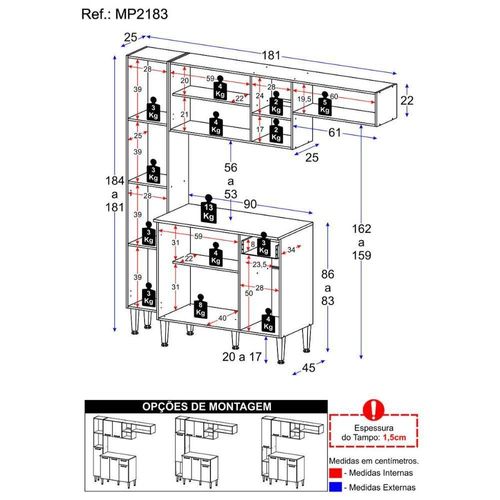 Dimensões do produto montado: Cozinha - Altura: 184cm | Largura: 181cm | Profundidade: 45cm Espaço para Fogão/Geladeira - Altura: 162cm | Largura: 61cm *Você pode consultar as medidas detalhadas na imagem técnica do produto.