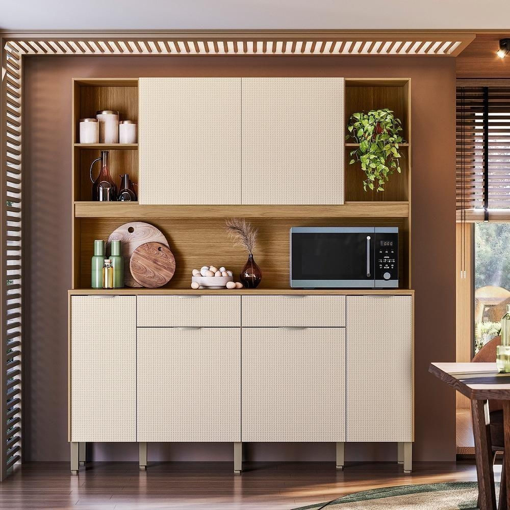 Armario de Cozinha Compacto 6 Portas BotanikaDeixe sua cozinha mais organizada e com visual moderno com um móvel completo, pensado para facilitar a rotina. Produzido em MDP de 12 e 15 mm, ele combina boa resistência com um acabamento caprichado para o uso diário. O destaque vai para o excelente espaço interno: são 6 portas e 2 gavetas amplas, além de prateleiras internas que ajudam a distribuir utensílios, mantimentos e louças. Os nichos para objetos de decoração valorizam o ambiente e permitem compor a cozinha com itens decorativos ou de uso rápido. O móvel também conta com espaço para micro-ondas e passa-fio, mantendo os cabos organizados e deixando o conjunto mais funcional. Para mais conforto no manuseio, possui dobradiças com amortecedor (fechamento suave) e corrediças telescópicas 100% metálicas, garantindo abertura estável e maior durabilidade. Os puxadores ergonômicos em alumínio reforçam a qualidade e facilitam o uso no dia a dia.Destaques:- Estrutura em MDP 12 e 15 mm - 6 portas + 2 gavetas amplas - Nichos decorativos + prateleiras internas - Espaço para micro-ondas + passa-fio - Dobradiças com amortecedor - Corrediças telescópicas 100% metálicas - Puxadores ergonômicos em alumínio - Pés reguláveis em plástico resistente - Portas superiores passantes + acabamento embutido - Pintura UV (secagem em luzes UV)Dimensões- Altura: 2,07 Metros - Largura: 1,79 Metros - Profundidade Inferior: 0,40 Metros - Produndidade Superior: 0,28 MetrosMaterial: MDP | Cor: Freijó/Soft | Cômodo Indicado: Cozinha | Dimensões do Produto (A X L X P): 207 x 179 x 40 | Possui Prateleira: Sim | Possui Gaveta: 2 Gavetas | Tipo da Corrediça da Gaveta: Telescópicas | Possui portas: Sim | Quantidade de portas: 6 Portas | Tipo de Porta: Bater | Possui porta Basculante: Não | Possui Pistão á Gás: não | Possui Nichos: Sim | Possui pés: Sim | Possui Vidro: Não | Quantidade de Vidros: 0 | Peso do Produto (Kg): 78,46 KG | Altura do Produto (cm): 207 | Largura do Produto (cm): 179 | Comprimento do Produto (cm): 40 | Nome do Simples no Fornecedor: Cozinha Botanika | Garantia do Fabricante: 3 Meses | Instruções/Cuidados: Evite contato com líquidos. Nada de lavar os móveis. Móveis não gostam de umidade. Não deixe o móvel exposto ao sol. Os acessórios também precisam de limpeza. | Necessita Montagem: Sim, a montagem é simples mas sugerimos a contratação de algum profissional experiente de sua preferência | Tamanho das Chapas: 12 e 15 mm | Material da Estrutura: MDP | Necessita Fixação na Parede: Não | Conteúdo Embalagem: Cozinha Botanika | Origem: Nacional | Estado de Origem: Paraná | Quantidade de Volumes: 2 | Peso Bruto (volume 01): 37,3 | Comprimento x Largura x Altura (volume 01): 184x54x6 | Peso Bruto (volume 02): 41,16 | Comprimento x Largura x Altura (volume 02): 87x78x11 Cor: Freijó/Soft