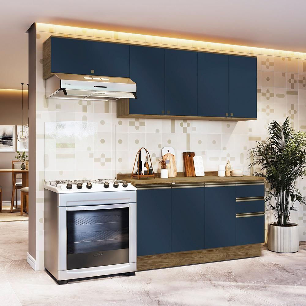 Armário De Cozinha Completa 100% Mdf 240cm Nogueira/azul Profundo Celeste Kappesberg