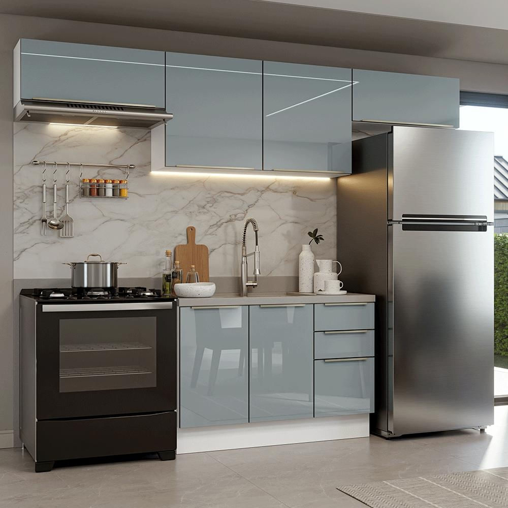 O destaque da linha Lux está no design: as portas com vidro sobreposto garantem um visual elegante e mais resistência, a combinação do branco com o cinza cria um ambiente moderno.