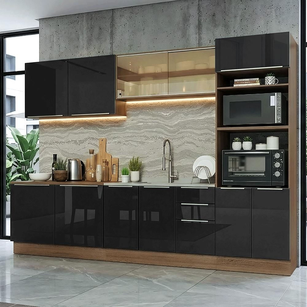 Armário de Cozinha Completa 310 cm Rustic/Preto Lux Madesa 04 Rustic/Preto