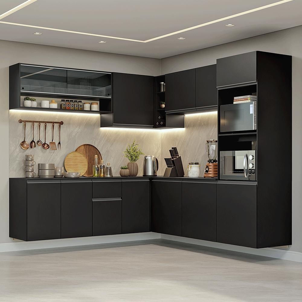 Armário De Cozinha Completa De Canto 445 Cm Suspenso Preto Nice Madesa 04 Preto