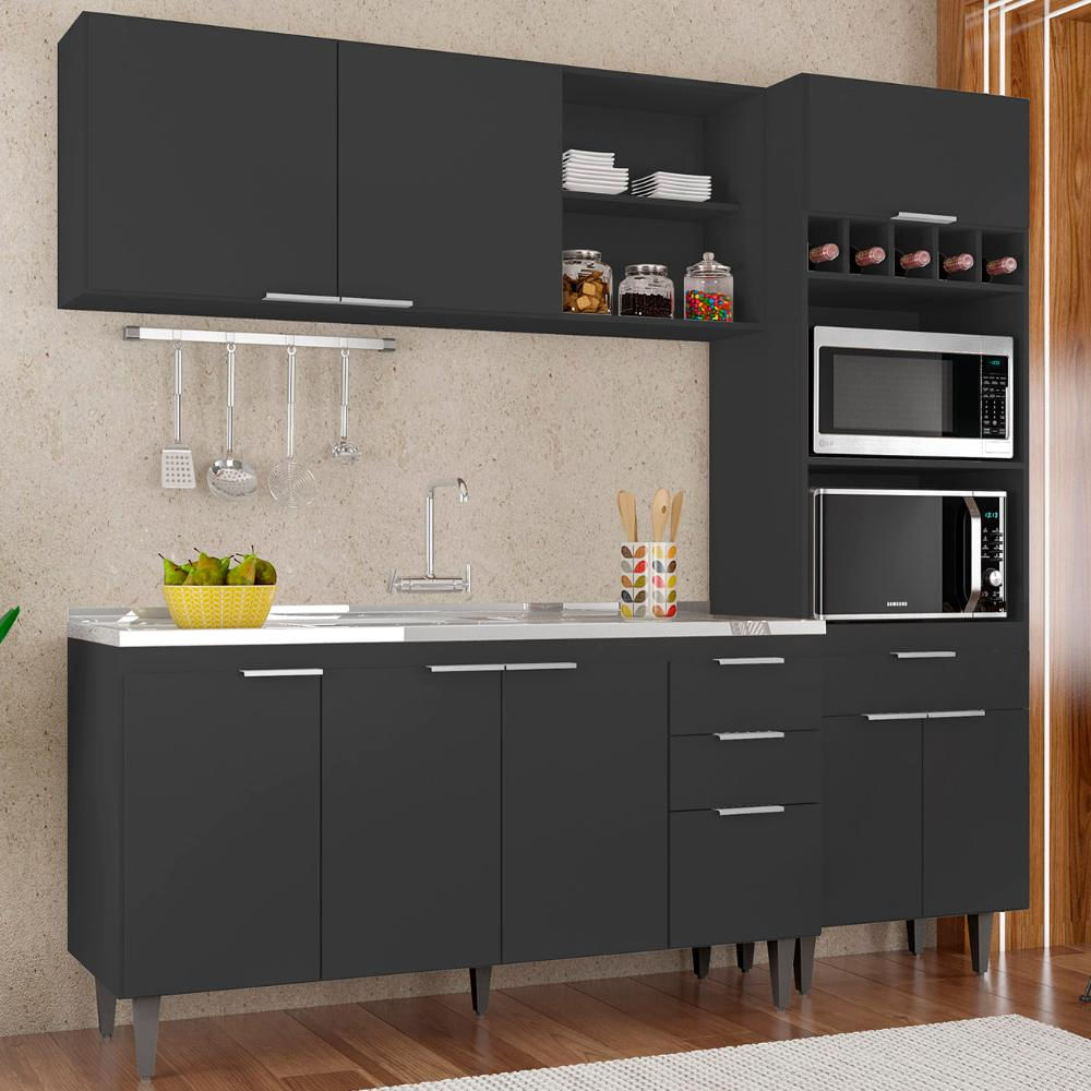 Características do Produto Material da Estrutura: MDP 15mm. Material do fundo: HDF 3mm. Peso Suportado: 138 Kg distribuídos. Acompanha Pia: Sim. Acompanha Tampo: Não. Acabamento: Melamina BP. Escala de brilho: Fosco. Possui Portas: Sim. Quantidade de Portas: 9 Portas. Tipo de Porta: Convencional/Basculante. Tipo de Dobradiças: Metálicas. Possui Gavetas: Sim. Quantidade de Gavetas: 3 Gavetas. Tipo de Corrediças: Metálicas. Possui Puxador: Sim. Material do Puxador: Alumínio. Possui Prateleiras: Sim. Quantidade de Prateleiras: 2 Prateleiras. Possui Nichos: Sim. Quantidade de Nichos: 9 Nichos. Possui Pés: Sim. Quantidade de Pés: 9 Pés. Material dos Pés: PVC. Altura dos Pés: 17cm com regulagem. Diferenciais: - Design moderno. - Nichos para micro-ondas e forno elétrico. - Puxadores em alumínio. - Dobradiças e corrediças metálicas. - Pés com regulagem de 17 à 19cm. Sistema de Montagem: Parafusos/Pregos. Manual de Montagem: Sim. Complexidade da Montagem: Alta. Conteúdo da Embalagem: 1 Armário Aéreo, 1 Balcão, 1 Paneleiro, 1 Pia. Garantia do Fabricante: 90 dias contra defeitos de fabricação. Volumes: 4 Volumes. Montagem: Recomendamos que seja feita por um profissional. Recomendação de Limpeza: Utilize pano levemente úmido.
