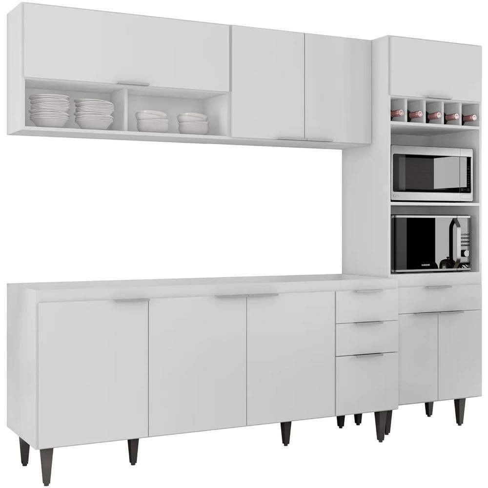 O Paneleiro conta com dois compartimentos para acomodar micro-ondas e forno elétrico, e cinco nichos na parte superior. Ele também inclui três portas, sendo uma delas basculante, além de uma gaveta. O Armário Aéreo 100cm vem com uma porta basculante com pistão a gás e dois nichos, enquanto o Armário Aéreo 80cm possui duas portas convencionais, com uma prateleira interna para auxiliar na organização dos seus utensílios de forma prática e eficiente. Já o Balcão Para Pia dispõe de quatro portas e duas gavetas, com uma prateleira interna que oferece amplo espaço de armazenamento. Todos os móveis possuem estrutura em MDP 15mm, com acabamento em BP, puxadores em alumínio, dobradiças e corrediças metálicas, que garantem máxima resistência no uso diário. Os pés em PVC, são reguláveis, permitindo ajustar pequenos desníveis de piso. O balcão não acompanha tampo para que o uso fique opcional com tampo ou pia. Este Armário de Cozinha é a solução ideal para otimizar sua casa, combinando materiais de alta qualidade com um design sofisticado.