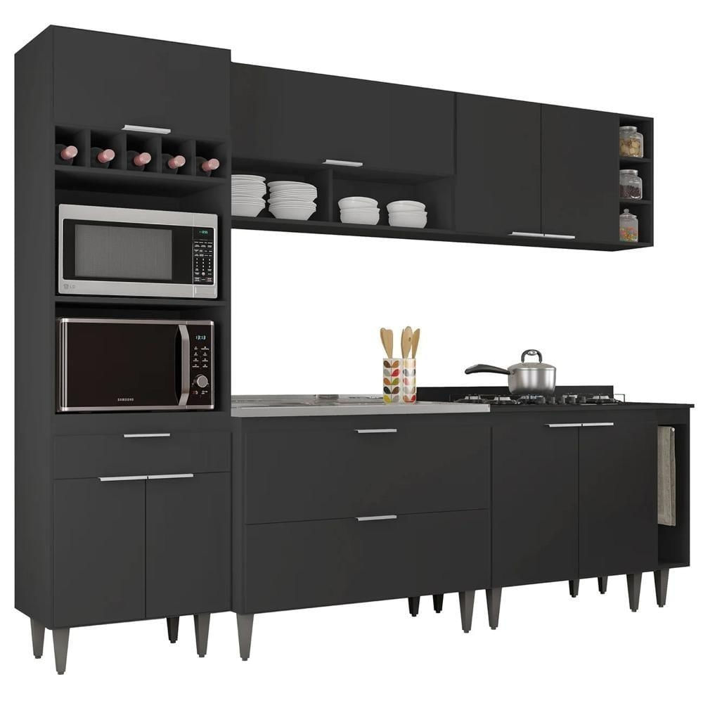 O Paneleiro conta com dois compartimentos para acomodar micro-ondas e forno elétrico, e cinco nichos na parte superior. Ele também inclui três portas, sendo uma delas basculante, além de uma gaveta para melhor organização dos seus utensílios. O Armário Aéreo 100cm possui uma porta basculante com pistão a gás e dois nichos, que se destacam com sofisticação e estilo. Já Armário Aéreo 80cm dispõe de duas portas convencionais, com uma prateleira interna. O Balcão Gabinete vem com duas portas basculantes com fecho trava de segurança, que permite o fechamento com um simples toque. Enquanto o Balcão 80cm com Tampo possui duas portas convencionais, com uma prateleira interna, oferecendo amplo espaço de armazenamento. Já o Balcão Porta Pano traz um suporte de aço para guardanapos e o nicho adega que conta com três repartições. Todos os móveis possuem estrutura em MDP 15mm, com acabamento em BP, puxadores em alumínio, dobradiças e corrediças metálicas, que garantem máxima resistência no uso diário. A Pia Inox apresenta um design ideal, que tem excelente desempenho no escoamento da água e possibilita o uso de diferentes objetos sobre ela. Os pés em PVC, são reguláveis, permitindo ajustar pequenos desníveis de piso. Este Armário de Cozinha é a solução perfeita para otimizar sua casa, combinando elegância e materiais de alta qualidade.