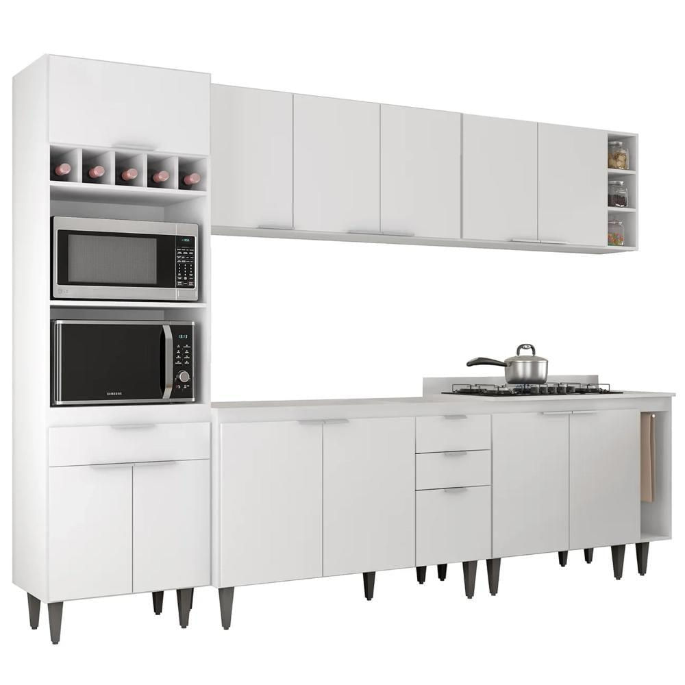 O Paneleiro conta com dois compartimentos para acomodar micro-ondas e forno elétrico, e cinco nichos na parte superior. Ele também inclui três portas, sendo uma delas basculante, além de uma gaveta para melhor organização dos seus utensílios. Os Armários Aéreos dispõe de cinco portas e duas prateleiras internas, oferecendo praticidade e estilo. O Balcão Para Pia e o Balcão 80cm com Tampo possuem cinco portas e duas gavetas, com duas prateleiras internas que proporcionam amplo espaço de armazenamento. Já o Balcão Porta Pano traz um suporte de aço para guardanapos e o nicho adega que conta com três repartições. Todos os móveis possuem estrutura em MDP 15mm, com acabamento em BP, puxadores em alumínio, dobradiças e corrediças metálicas, que garantem máxima resistência no uso diário. Os pés em PVC, são reguláveis, permitindo ajustar pequenos desníveis de piso. O balcão gabinete não acompanha tampo para que o uso fique opcional com tampo ou pia. Este Armário de Cozinha é a solução ideal para otimizar sua casa, combinando materiais de alta qualidade com um design sofisticado.