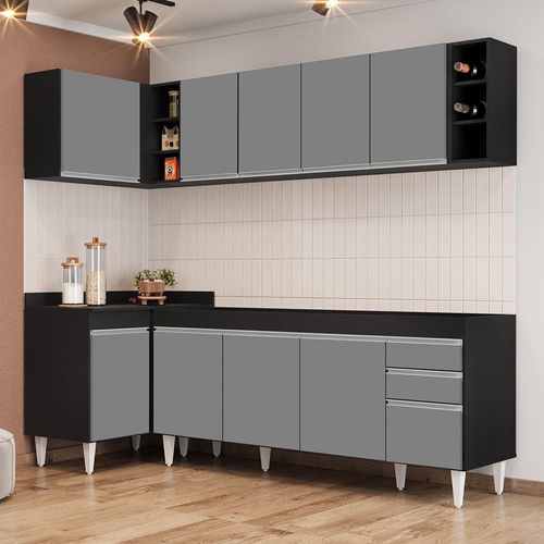 Renove a sua cozinha com o Armário de Cozinha Modulado de Canto Direito 5 Peças CP43 Balcão sem Tampo Preto/Cinza, da Lumil, você terá tudo o que precisa ao seu alcance. Composto por 5 peças, sendo balcão para pia 180cm, armários aéreos, balcão de canto e nicho garrafeiro , esse armário modulado oferece uma distribuição interna perfeita para organizar todos os seus utensílios.