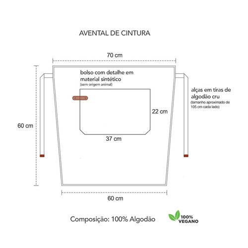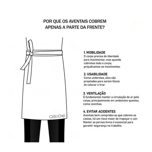 Avental de cintura. Ajustavel na cintura, atraves das tiras para amarrar e bolso frontal. Ideal para chef de cozinha, barista, jardinagem, pintura e outros. Este avental é pratico, basico, veste bem e fácil de lavar. O avental profissional da CasaCha atende bem aos clientes mais exigentes priorizando conforto, qualidade e estilo. O material sintetico não é proveniente de origem animal.