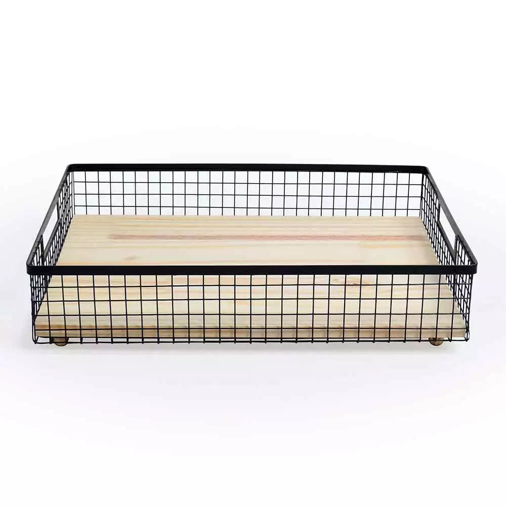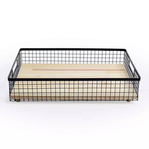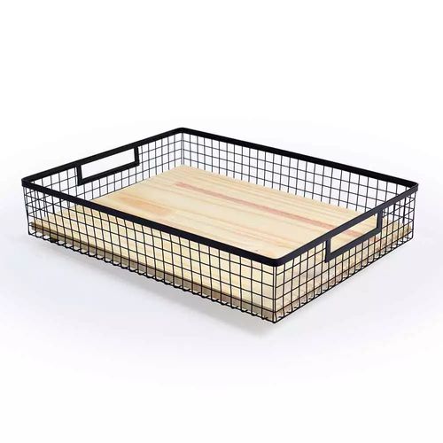 Bandeja Retangular Decorglass com Tela de Ferro e Base em Madeira Grande - 1 Peça