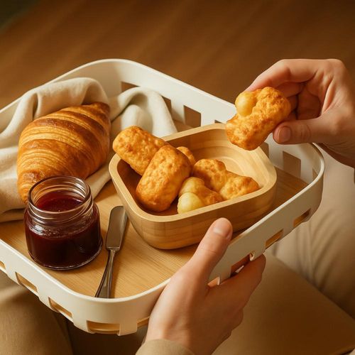 Elegante e versátil, esta bandeja para servir é perfeita para tornar momentos simples em experiências especiais. Com formato retangular e dimensões de 35x29cm, apresenta um delicado tom bege que combina facilmente com diferentes estilos de decoração. Sua base em bambu confere resistência, durabilidade e um toque natural que transmite aconchego, além de ser um material sustentável e fácil de limpar. Ideal para servir café da manhã na cama, levar lanches à mesa ou organizar aperitivos em encontros com amigos e familiares, também pode ser utilizada como peça decorativa, acomodando flores, velas ou pequenos objetos. Seu design funcional garante praticidade no dia a dia, enquanto seu acabamento cuidadosamente trabalhado adiciona charme e sofisticação ao ato de servir.