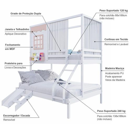 DETALHES Acabamento: Branco/ Rosa PU (pode mostrar veios da madeira) Estrutura: Madeira Maciça de Pinus de Reflorestamento Medidas dos Colchões da Cama de Solteiro (cm x cm): 88x188 (Não Incluso) Medidas dos Colchões da Cama de Casal (cm x cm): 138x188 (Não Incluso) Peso Suportado Cama de Solteiro: 120 Kg Peso Suportado Cama de Casal: 240 Kg Diferenciais: Escada com Leve Curvatura, Cortina, Kit Escada/ Escorregador, Casinha com fechamento em MDF, Janela e Prateleira para Livros e Decoração, Montagem Reversível (Lado Direito ou Lado Esquerdo) DIMENSÕES DO BELICHE MONTADO Altura (cm):225 Largura (cm):199,4 Profundidade (cm):146,7