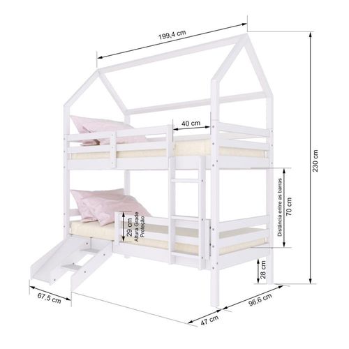 DETALHES Acabamento: Branco PU (pode mostrar veios da madeira) Estrutura: Madeira Maciça de Pinus de Reflorestamento Medidas dos Colchões da Cama de Solteiro (cm x cm): 188x88 (Não Incluso) Peso Suportado Cama: 120 Kg Diferenciais: Escada Fixa, Grade de Proteção Dupla, Casinha, Grade Removível, kit escada/escorregador DIMENSÕES DO BELICHE MONTADO Altura (cm):230 Largura (cm):199,4 Profundidade (cm):96,6