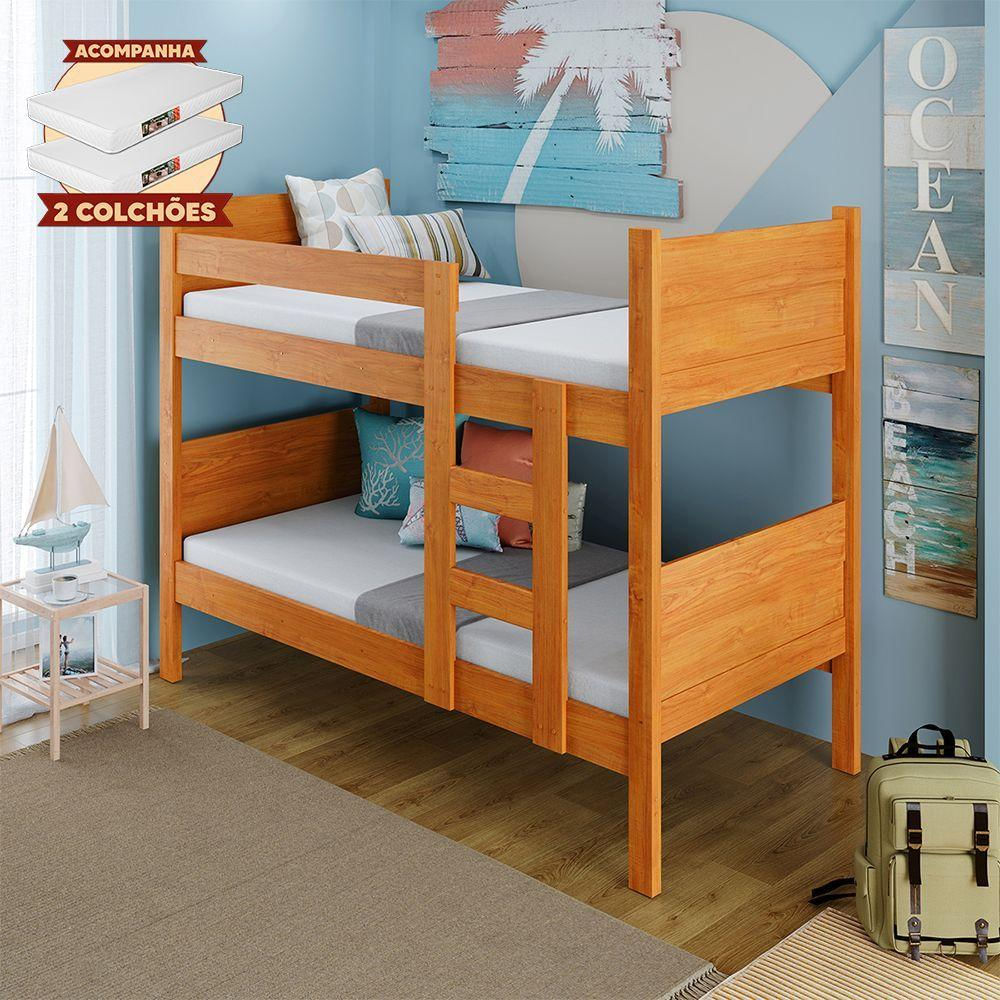Transforme o quarto em um espaço prático, moderno e aconchegante com o Beliche Fortaleza.Desenvolvido com matéria-prima de alta qualidade e design inteligente, este beliche é a solução ideal para quem busca funcionalidade, resistência e aproveitamento de espaço sem abrir mão do estilo.Benefícios:Otimização de espaço: Ideal para quartos compactos, permitindo acomodar duas pessoas confortavelmente no espaço de uma cama.Praticidade no dia a dia: Fácil de montar e desmontar, adaptando-se a diferentes ambientes.Versatilidade de uso: Pode ser utilizado em residências, pousadas, repúblicas ou dormitórios coletivos.Acabamento de qualidade: Proporciona um visual elegante que harmoniza facilmente com diferentes estilos de móveis.Design robusto e moderno ? Estrutura firme que garante estabilidade e segurança durante o uso.Procedência: Nacional, fabricado com padrões de qualidade rigorosos.Garantia: 3 meses contra defeitos de fabricação.OBS: Acompanha 2 colchões!CaracterísticasTipo: BelicheModelo: VenezaCor: NatureDIMENSÕES DO PRODUTO - BelicheAltura: 161cmLargura: 96cmComprimento: 202cmDIMENSÕES DO COLCHÃOAltura: 12cmLargura: 88cmComprimento: 188cmATENÇÃOAS IMAGENS SÃO MERAMENTE ILUSTRATIVAS E PODEM SOFRER VARIAÇÕES DE COR E PEQUENOS DETALHES DE ACORDO COM O SEU MONITOR, ILUMINAÇÃO DO AMBIENTE E ATÉ MESMO A SUA PERCEPÇÃO VISUAL.Beliche Resistente Fortaleza em Mdf Vira 2 Camas Solteiro Nature Amadeirado com 2 Colchões