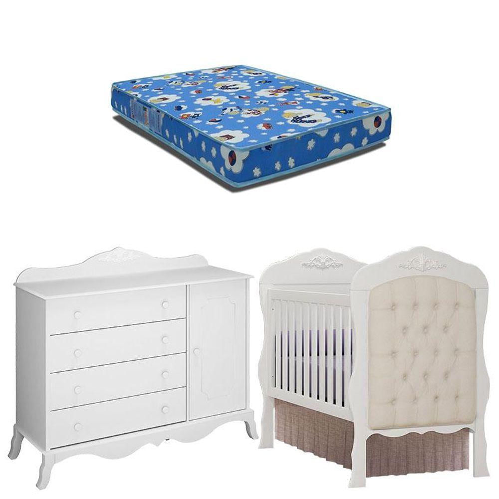 Berço Americano Capitone Com Colchão E Cômoda Infantil Realeza Branco Acetinado - Canaã