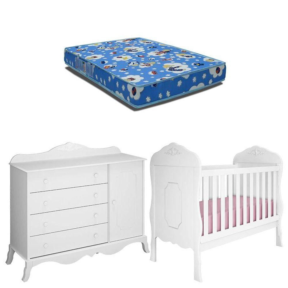 Berço Americano Com Colchão E Cômoda Infantil Realeza Branco Acetinado - Canaã
