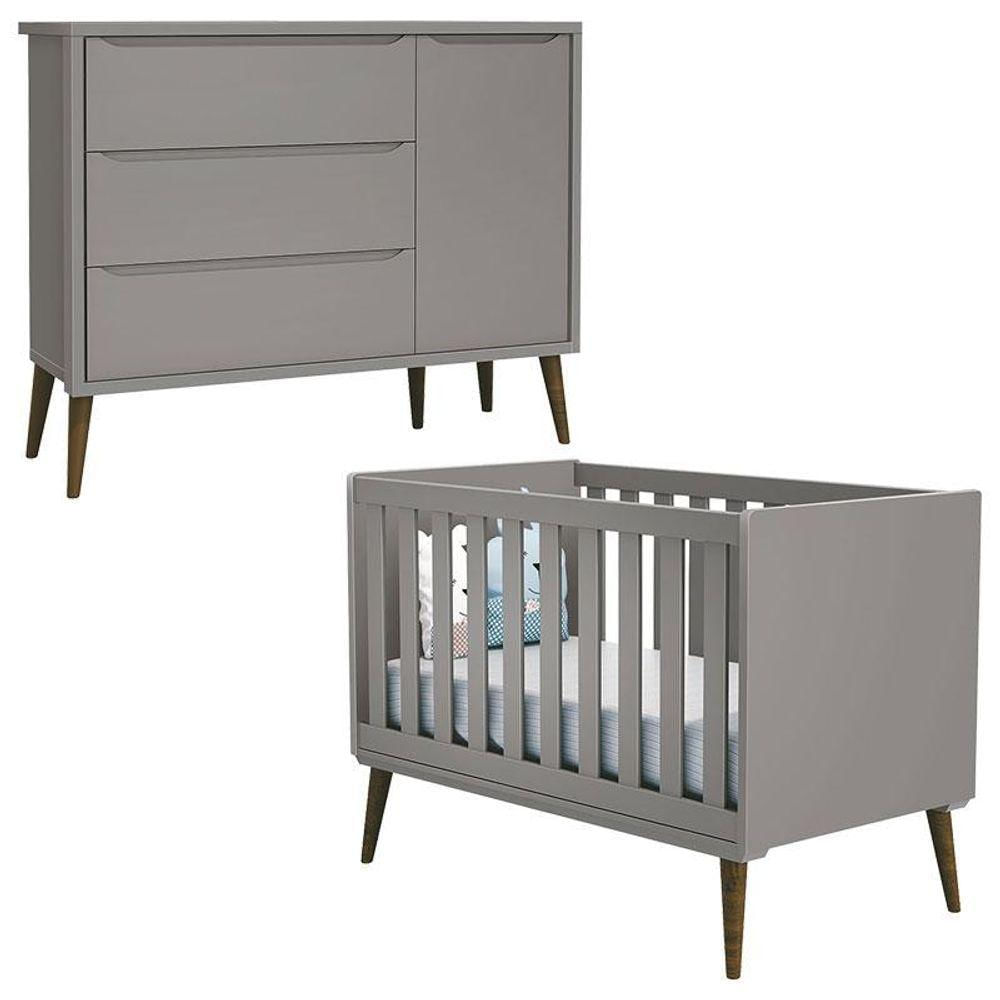 Berço Americano E Cômoda Com Porta Infantil Theo Cinza Com Pés Amadeirado - Reller
