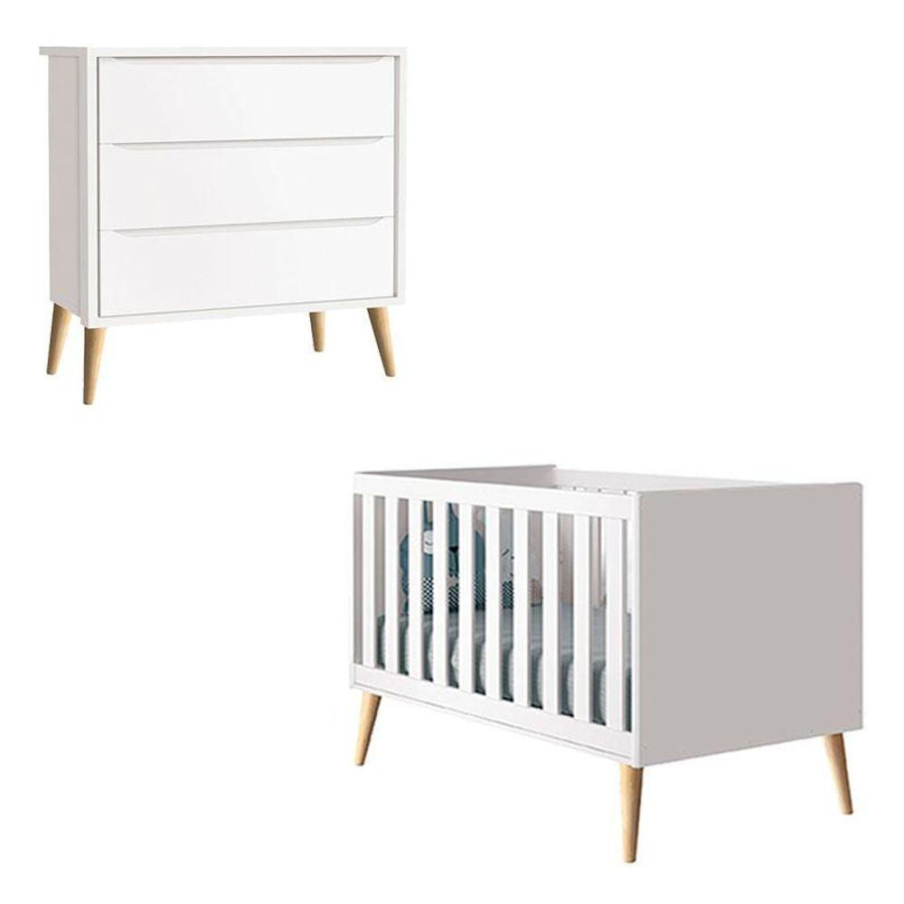 Berço Americano E Cômoda Gaveteiro Infantil Theo Branco Acetinado Com Pés Madeira Natural - Reller