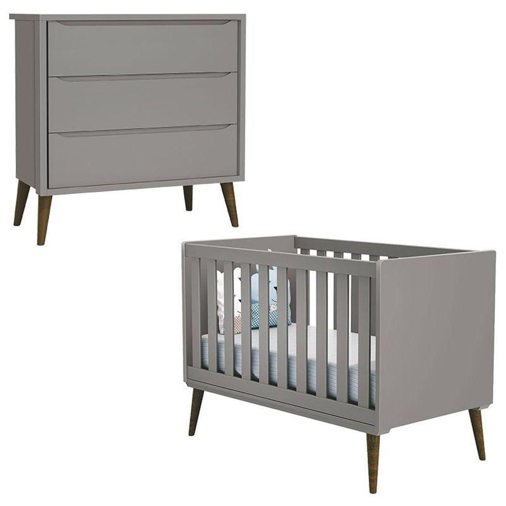Berço Americano E Cômoda Gaveteiro Infantil Theo Cinza Com Pés Amadeirado - Reller
