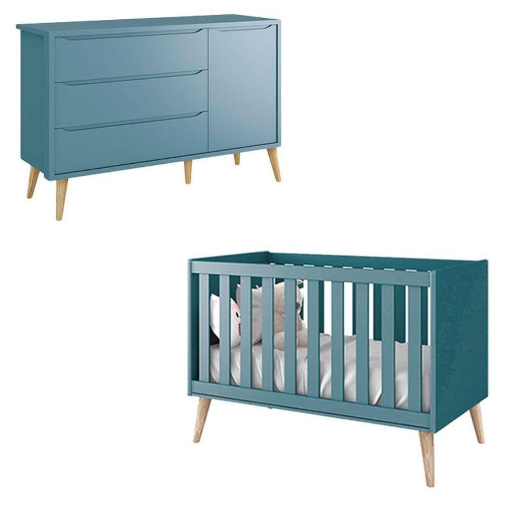 Berço Americano E Cômoda Infantil 1 Porta Theo Azul Com Pés Madeira Natural - Reller