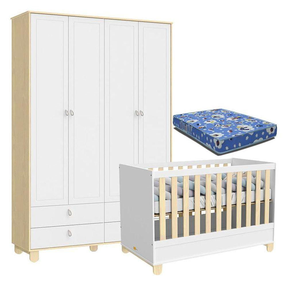 Berço Americano E Guarda Roupa Infantil 4 Portas Rope Natural Branco Acetinado Com Colchão - Matic