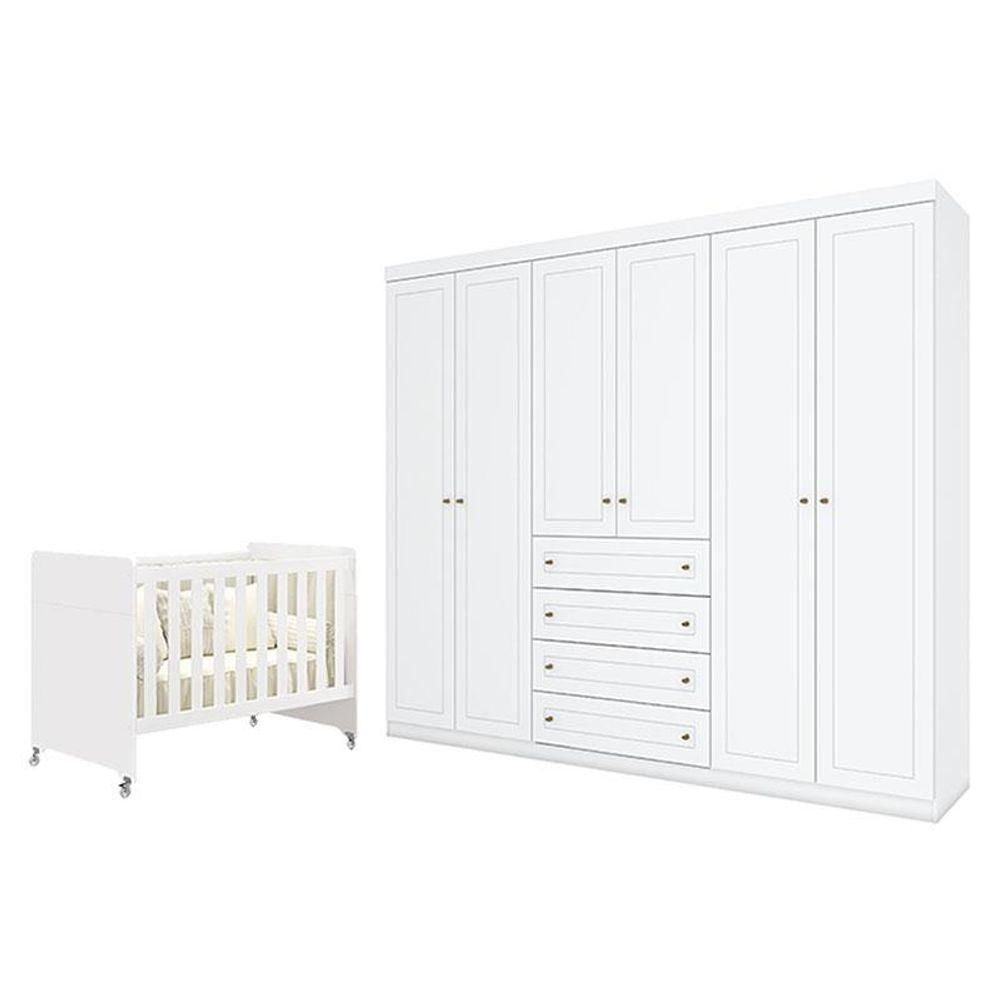 Berço Americano Evolution 4 Em 1 Branco Acetinado E Guarda Roupa Casal Americano 6 Portas Branco Hp - Henn