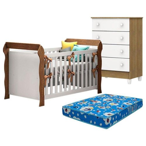 Berço Americano Lara e Cômoda Gaveteiro Mel Flat Branco Acetinado Amadeirado com Colchão Ortobom – CarolinaComeçou a montar o quartinho do seu pequeno? Então apresentamos para você este belo conjunto composto pelo berço americano da linha Lara acompanhado do colchão Ortobom e a cômoda da linha Mel Flat. Proporcionando mais conforto para seu bebê descansar e praticidade para a mamãe. Ambos fabricados pela Carolina são desenvolvidos em MDP/ MDF de qualidade garantindo uma maior durabilidade! Confira as características:Berço Americano Lara Branco Acetinado Amadeirado - Carolina- Desenvolvido em MDF/MDP - Pintura na cor Branco Acetinado Amadeirado - Pintura e acabamento em U.V que não faz mal a saúde do bebê - Alta Resistência - Superfícies e bordas lisas e retas - Estrado em madeira maciça com duas alturas de regulagem - Padrão americano - Acompanha suporte mosquiteiro - Indicado colchão 70x130 cm - Função mini cama e sofá cama aumentando a vida útil do móvel - Maior segurança para o seu bebê - Lindo design Dimensões: Altura: 90 cm Largura: 154 cm Profundidade: 78 cmCômoda Gaveteiro Mel Flat Branco Acetinado Amadeirado - Carolina- Desenvolvido em MDP - Acabamento em pintura UV na cor Branco Acetinado Amadeirado - Sistema de pintura atóxica, que não tem cheiro e não faz mal a saúde do bebê - Possui 04 Gavetas com corrediças metálicas - Puxadores em PVC - Peso suportado das gavetas é de 3kg - Peso suportado do tampo é de 5kg - Sistema anti-tombamento fixado na parede, para maior segurança - Kit pés em PVC - Lindo designDimensões:Altura: 92 cm Largura: 64 cm Profundidade: 43 cmColchão Berço Americano Phisical 130x70 cm – Ortobom- Tecido plano 100% poliéster - Placa de espuma em 100% poliuretano desempenho do INMETRO aprovada - Revestimento inferior em plástico impermeável - Proteção 100% espuma e tecido contra formação e colonização de ácaros, bactéria e fungos trazendo mais segurança e auxiliando na saúde do bebê - Padrão americano - Produto de origem nacional - Lindo design - Carinho e conforto que o seu bebê merece.Dimensões: Altura: 10 cm Largura: 70 cm Profundidade: 130 cmInformações importantes:*Não realizamos a montagem ou instalação do produto, porém acompanha manual de instruções. *Toda mercadoria segue segurada contra qualquer sinistro, em caso de anormalidade, recuse. *Conferir a quantidade de volumes. *As caixas ou pacotes possuem identificação com o nome, cidade e quantidades de volumes relativos à compra para conferencia do recebedor.