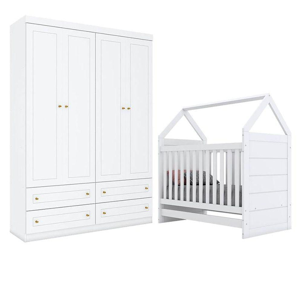 Berço Montessoriano Americano e Guarda Roupa Infantil Mississipi 4 Portas Branco HP - Henn