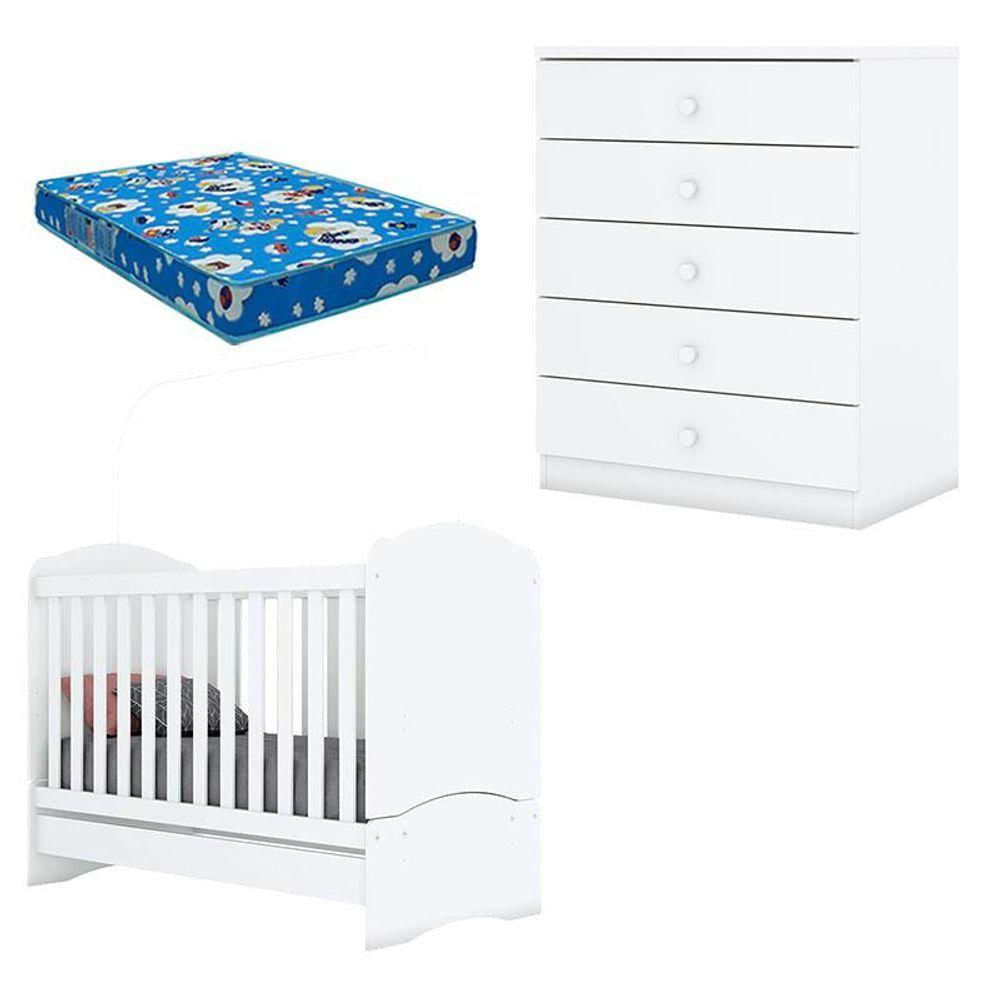 Berço Nacional Bala De Menta E Cômoda Infantil Pique-esconde Branco Com Colchão Ortobom