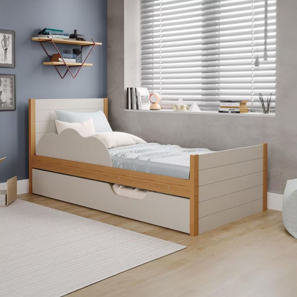 Bicama de Solteiro Cimol Divã com Cabeceira, Peseira e Grade de Proteção Naturale com Off White