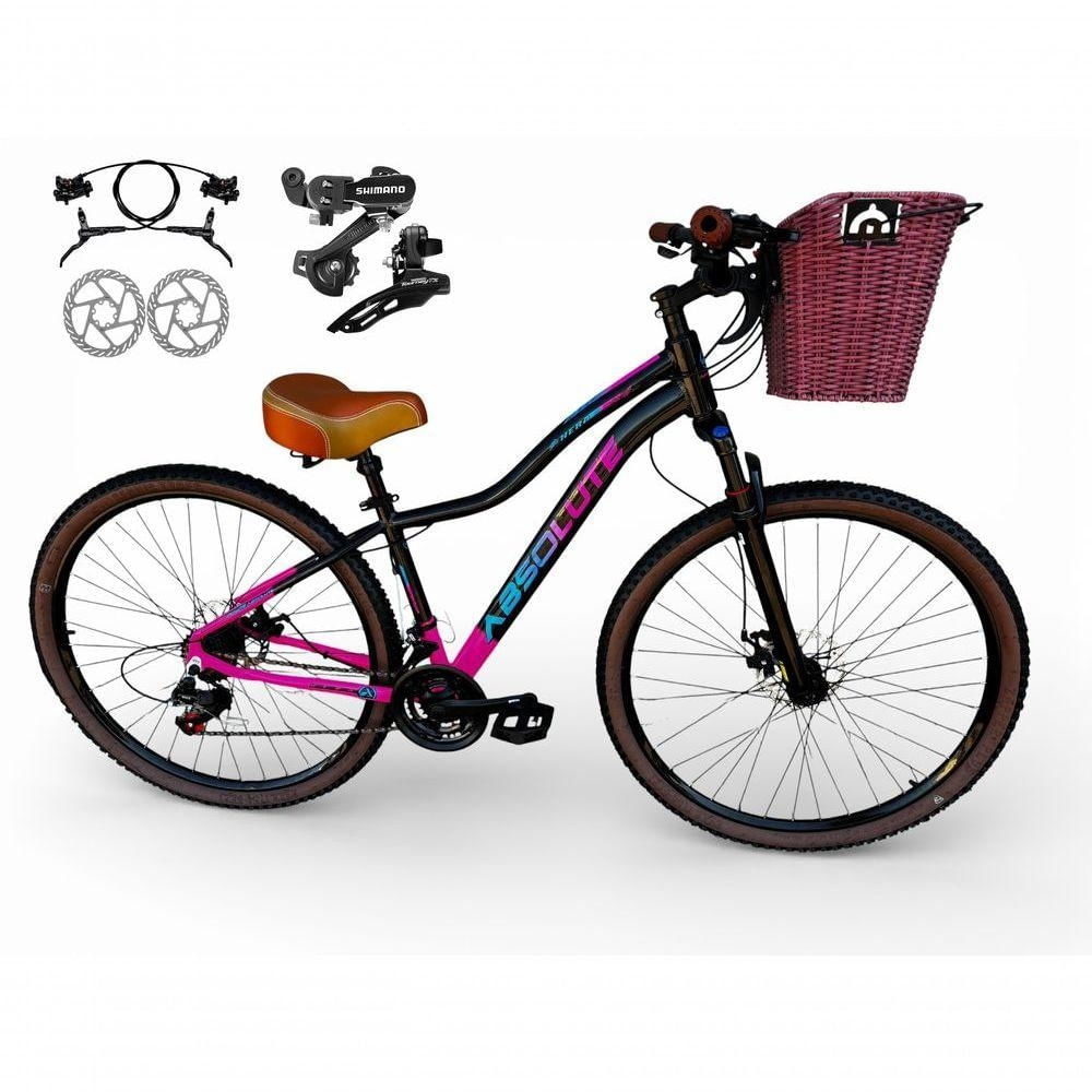 Bicicleta Aro 29 Feminina Absolute Hera Retrô Vintage Shimano 21v Hidráulica Confortável Cesta Preto/rosa Tamano 17