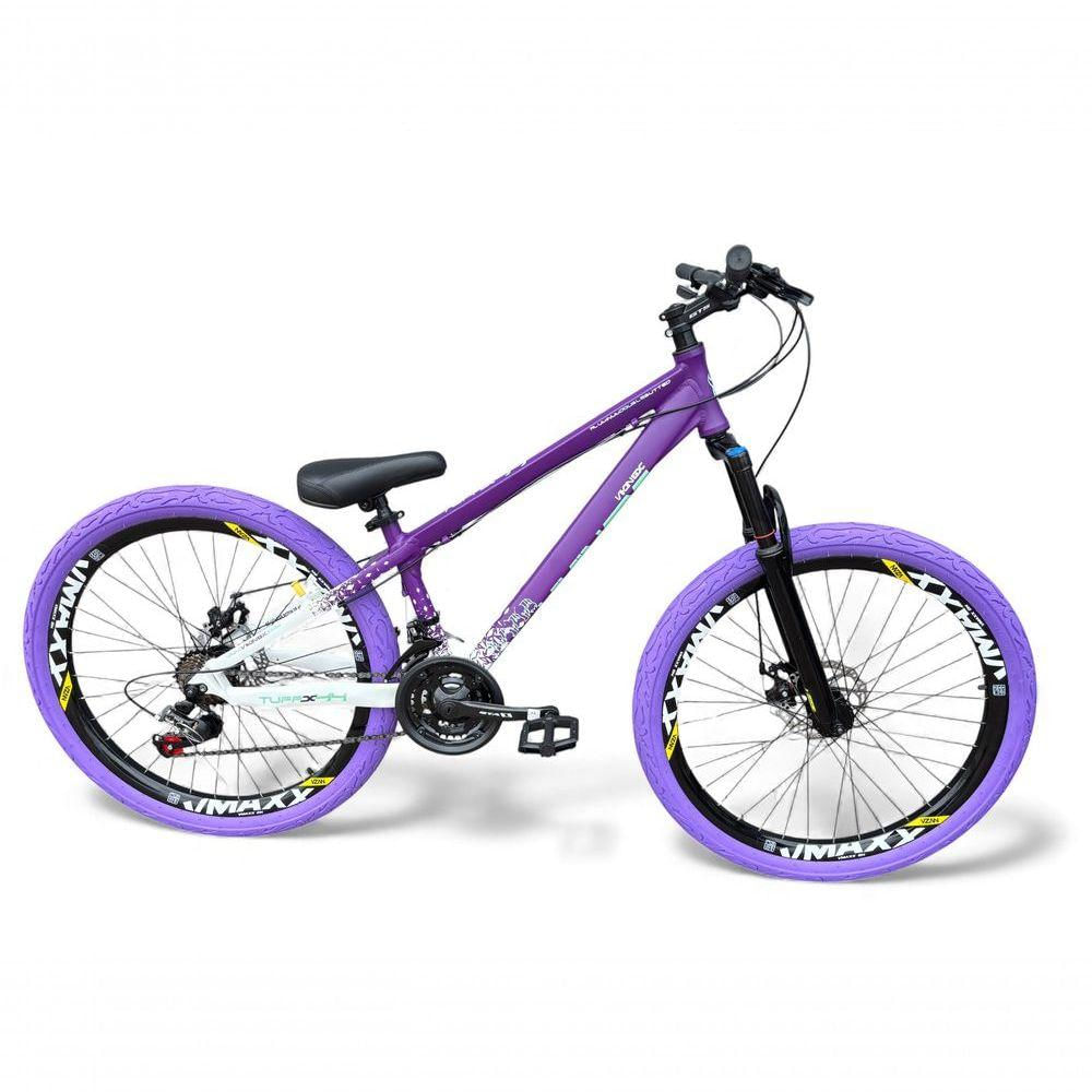 Bicicleta aro26 Vikingx Tuff X44 Freeride Dh 21v aroVmaxx FreioDisco Garfo Pneu Flame RoxoBranco