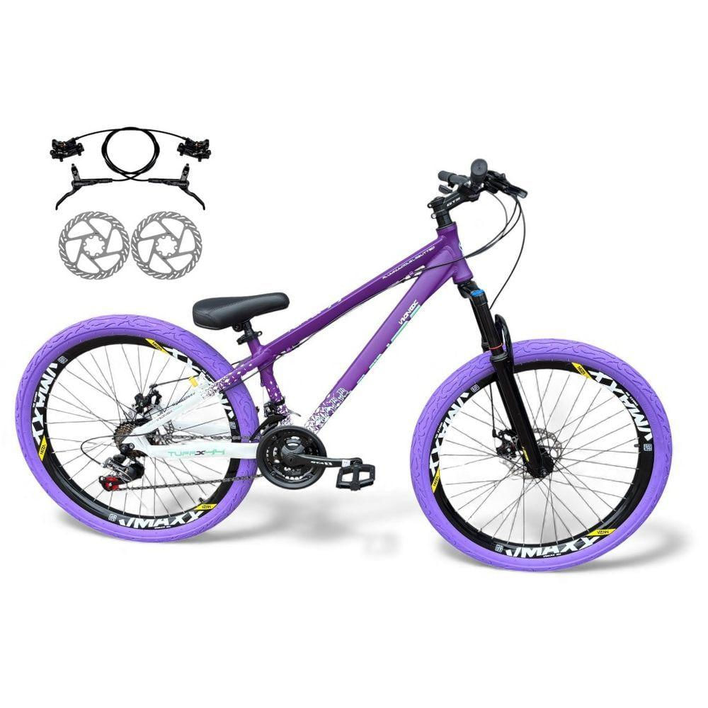 Bicicleta aro26 Vikingx Tuff X44 FreioHidráulico21v Freeride Rodas Vmaxx Pneu Flame RoxoBranco