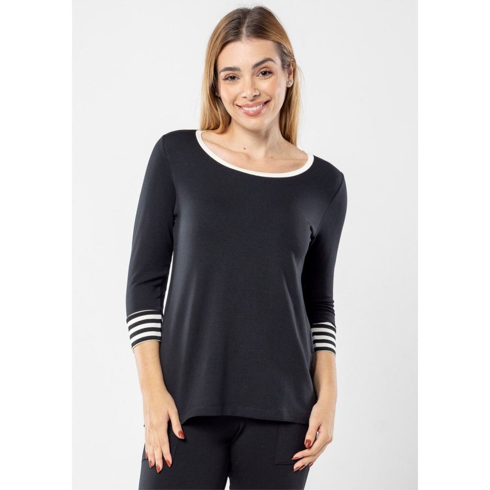 Blusa decote redondo e mangas 3/4.